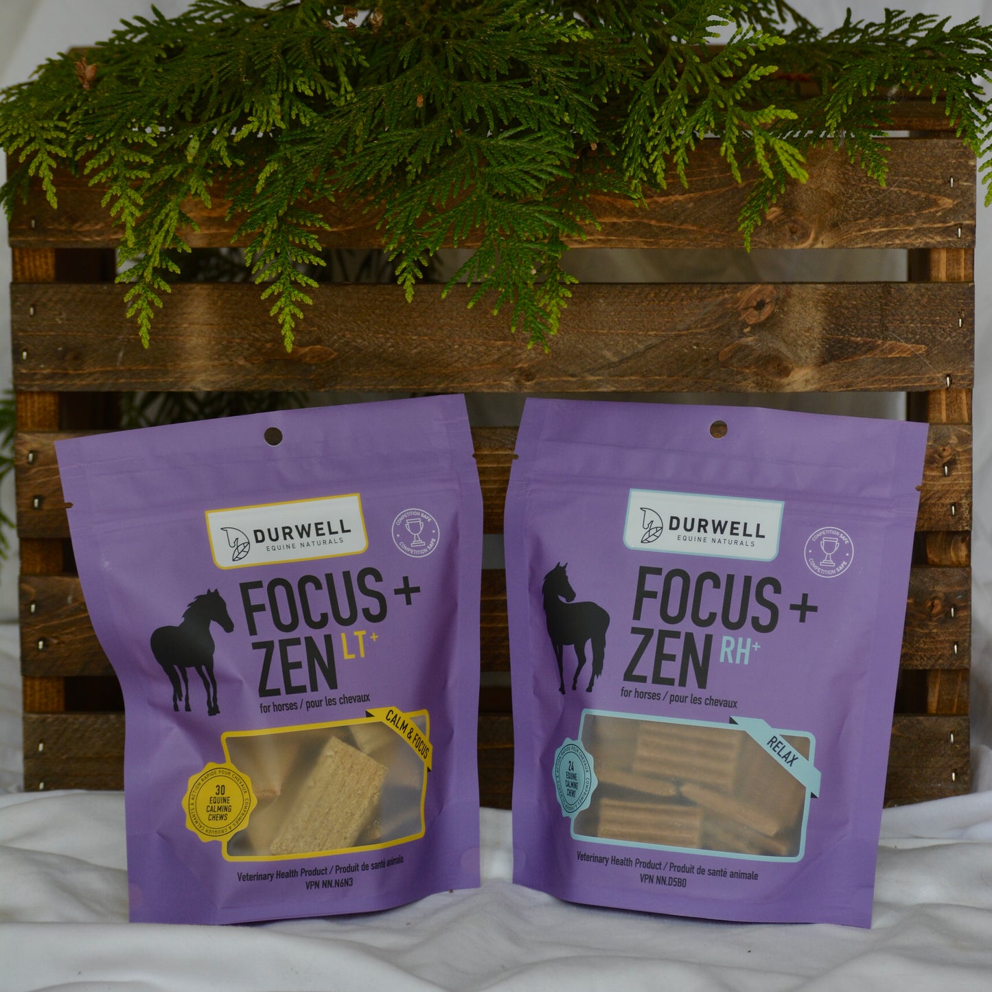 What are they? Focus + Zen LT+ chews promote calm and focus without sedation. Fous + Zen RH+ chews promote greater relaxation. Neither cause sedation, allowing horses to maintain its good energy.